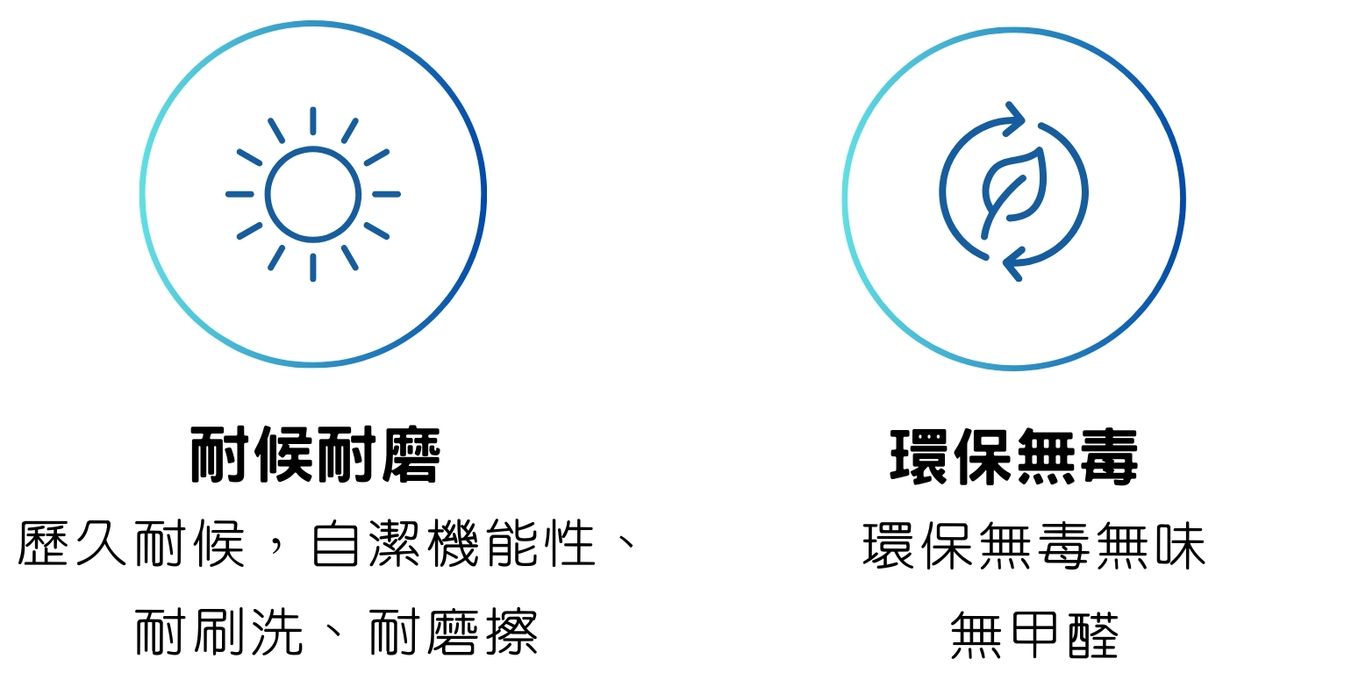 樹脂成份高,無粗糙毛細孔、微抗裂、不易卡髒污,清水沖洗即可除去灰塵(不可用清潔劑,清水即可)