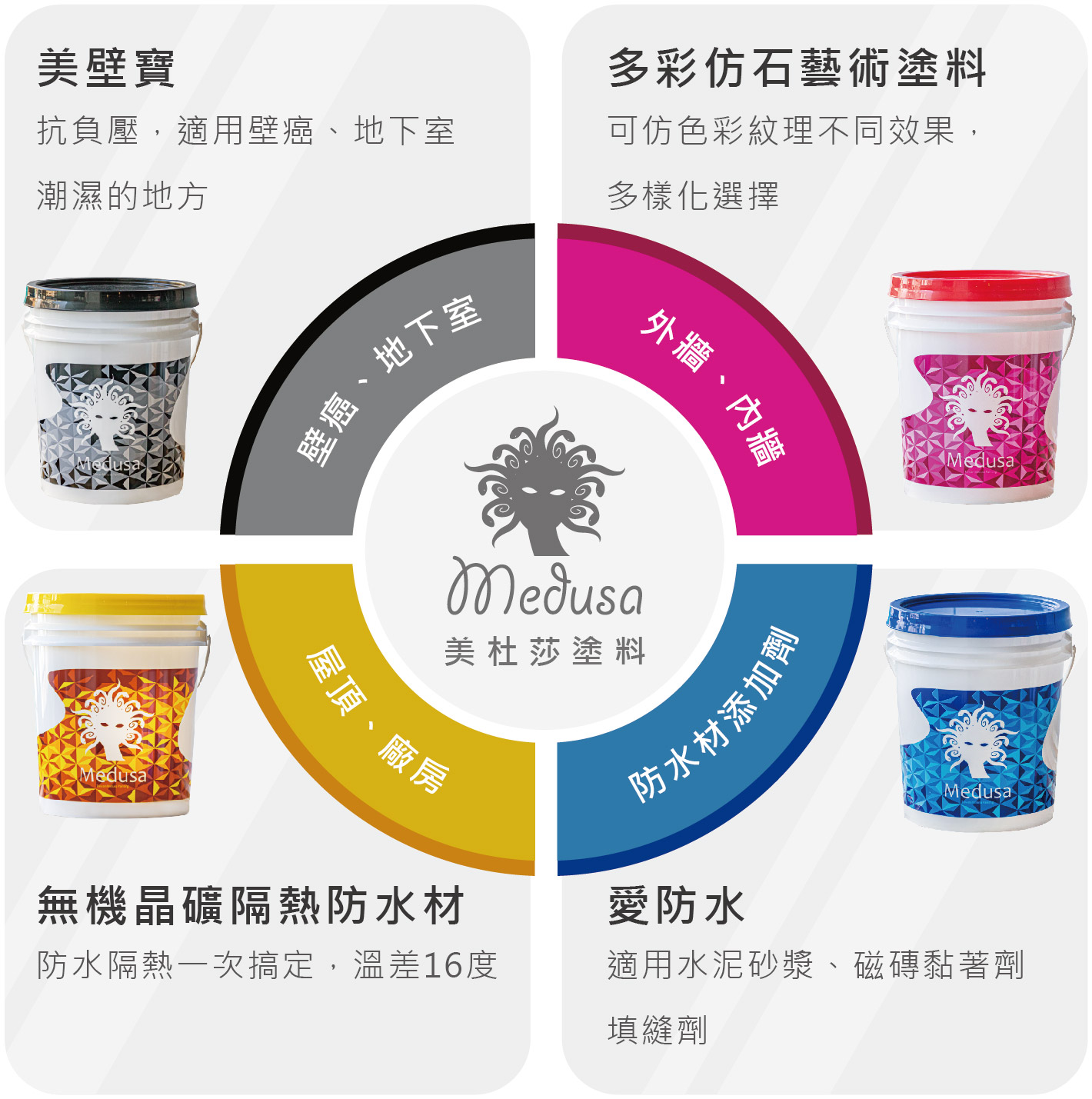 材料: 抗壁癌產品-美壁寶、防水底漆、批土、多彩塗料/水泥漆/乳膠漆等裝飾面漆。