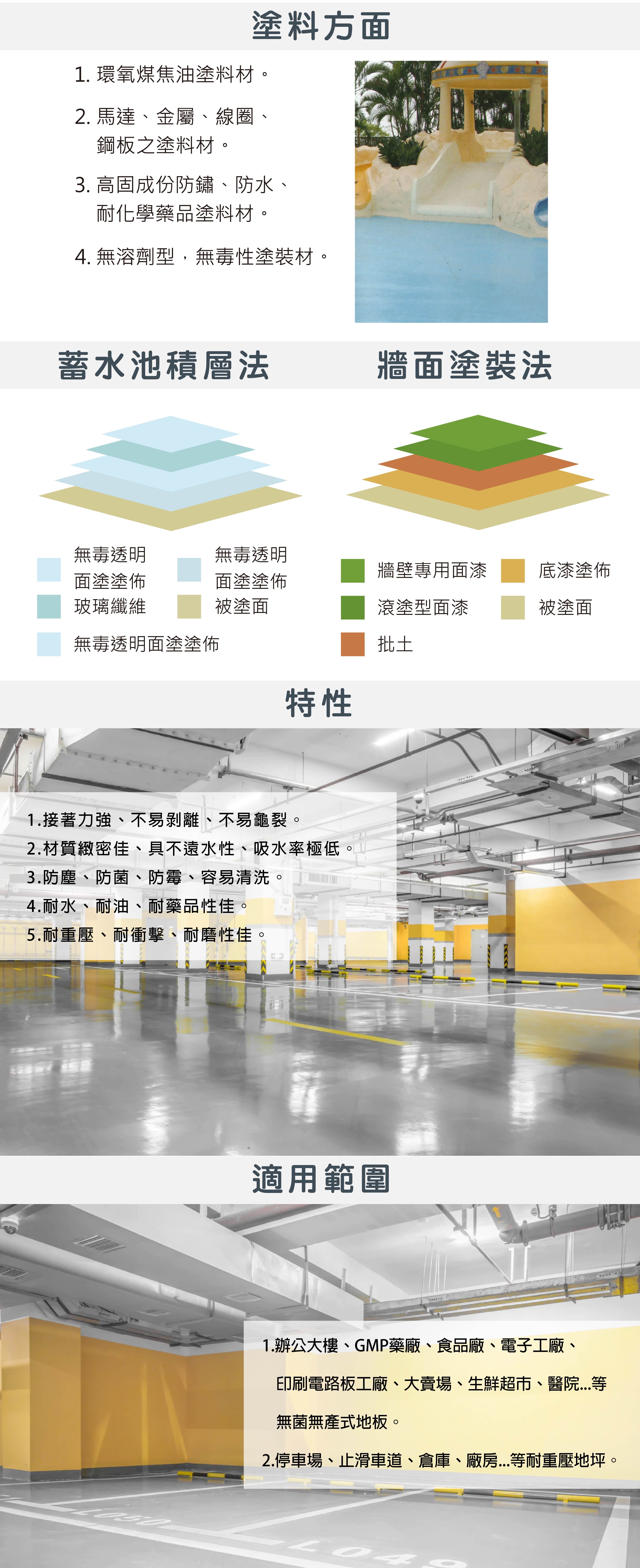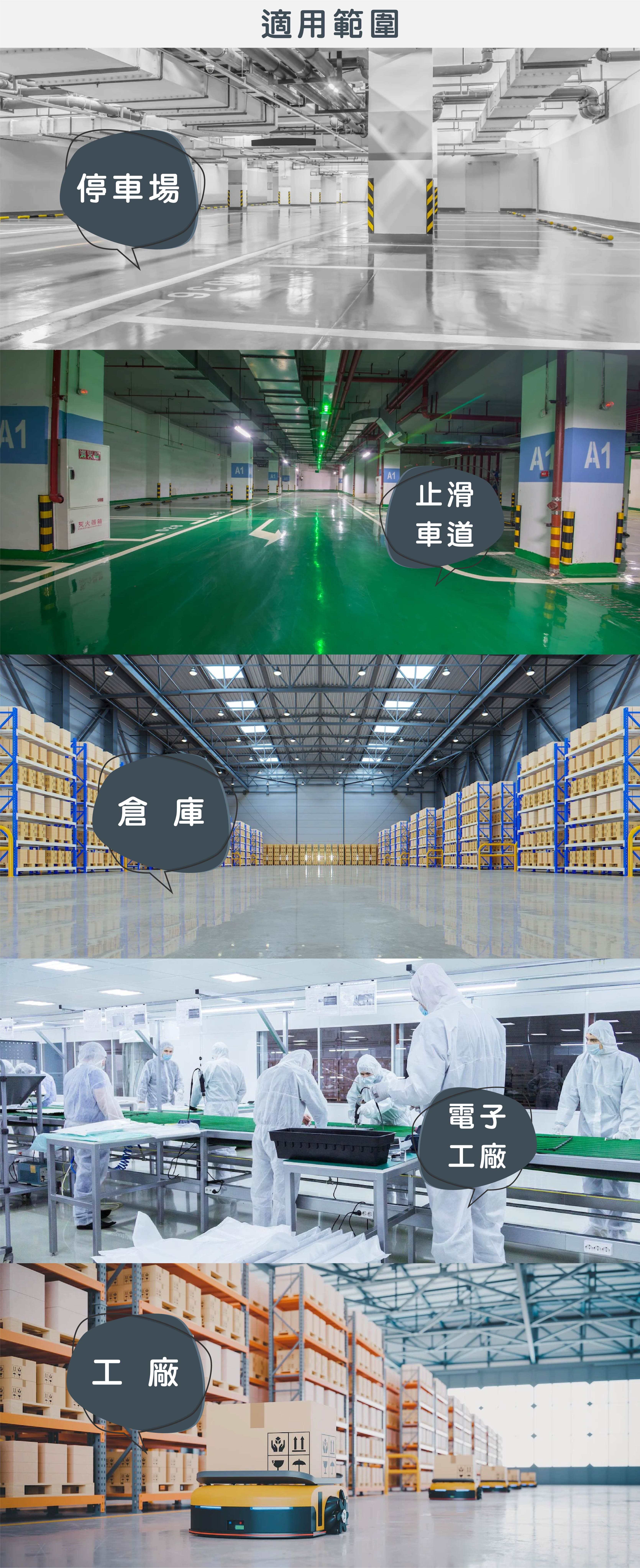 一般用於GMP藥廠、食品廠、電子廠、紡織廠、辦公室、醫院、手術房、無菌房、實驗室及一般輕、重負荷工廠地板使用 。