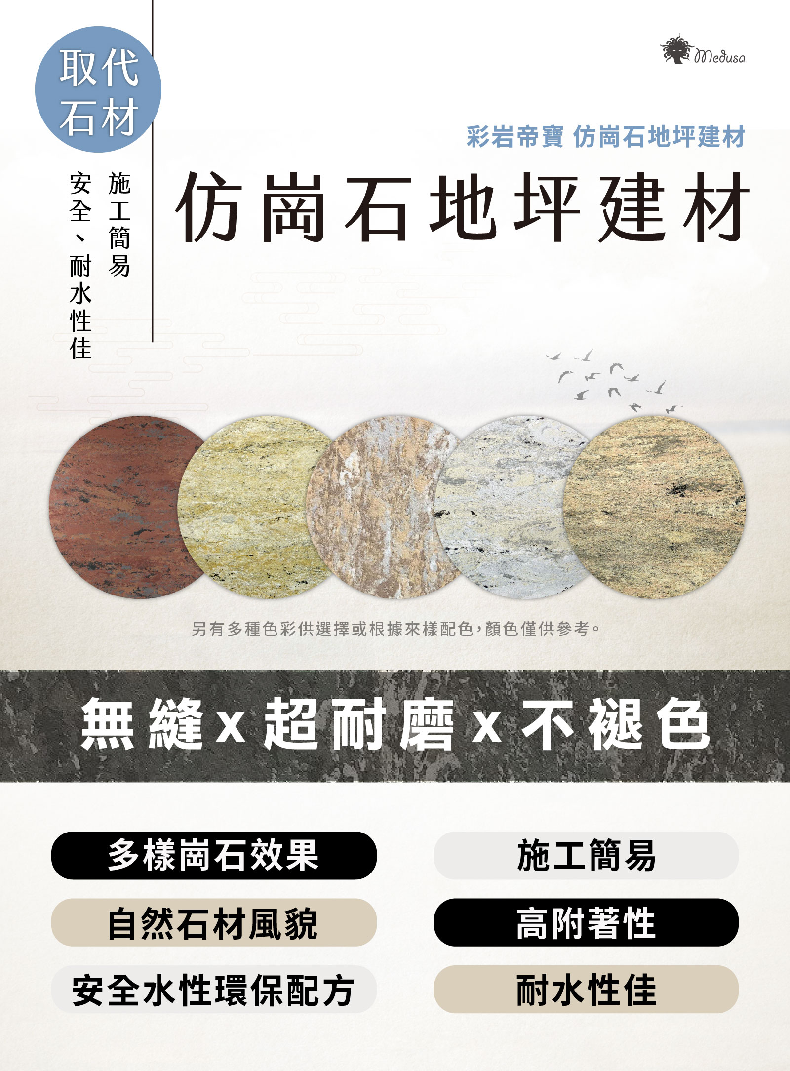 色彩經過比對天然石材、花崗岩、磁磚,分析後精準調色,可呈現很好的色彩紋理,大面積施工不會有色差,色彩保有穩定度。