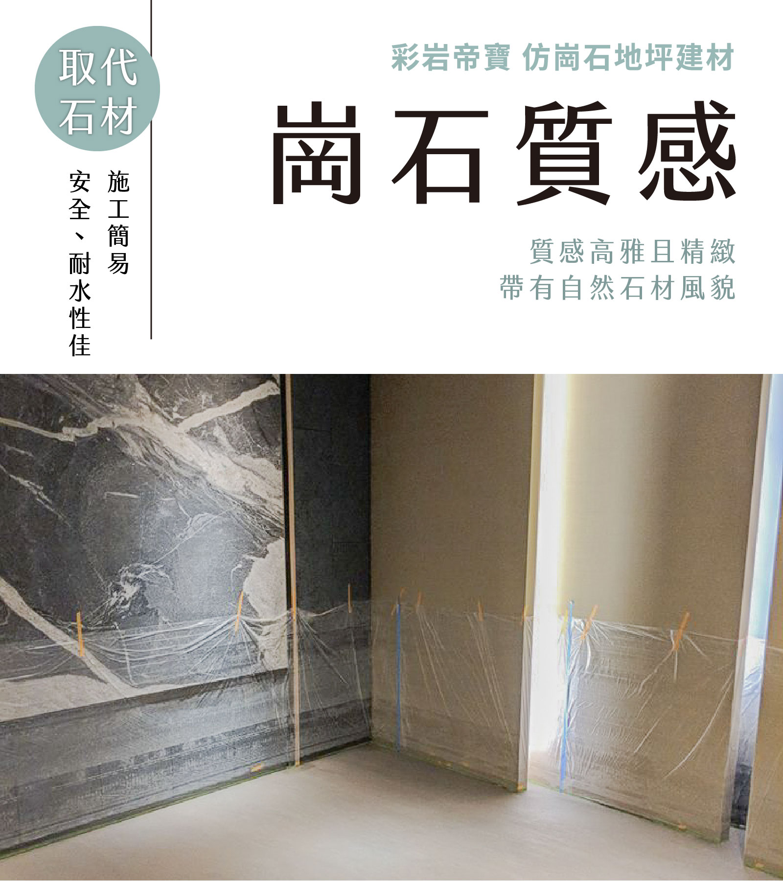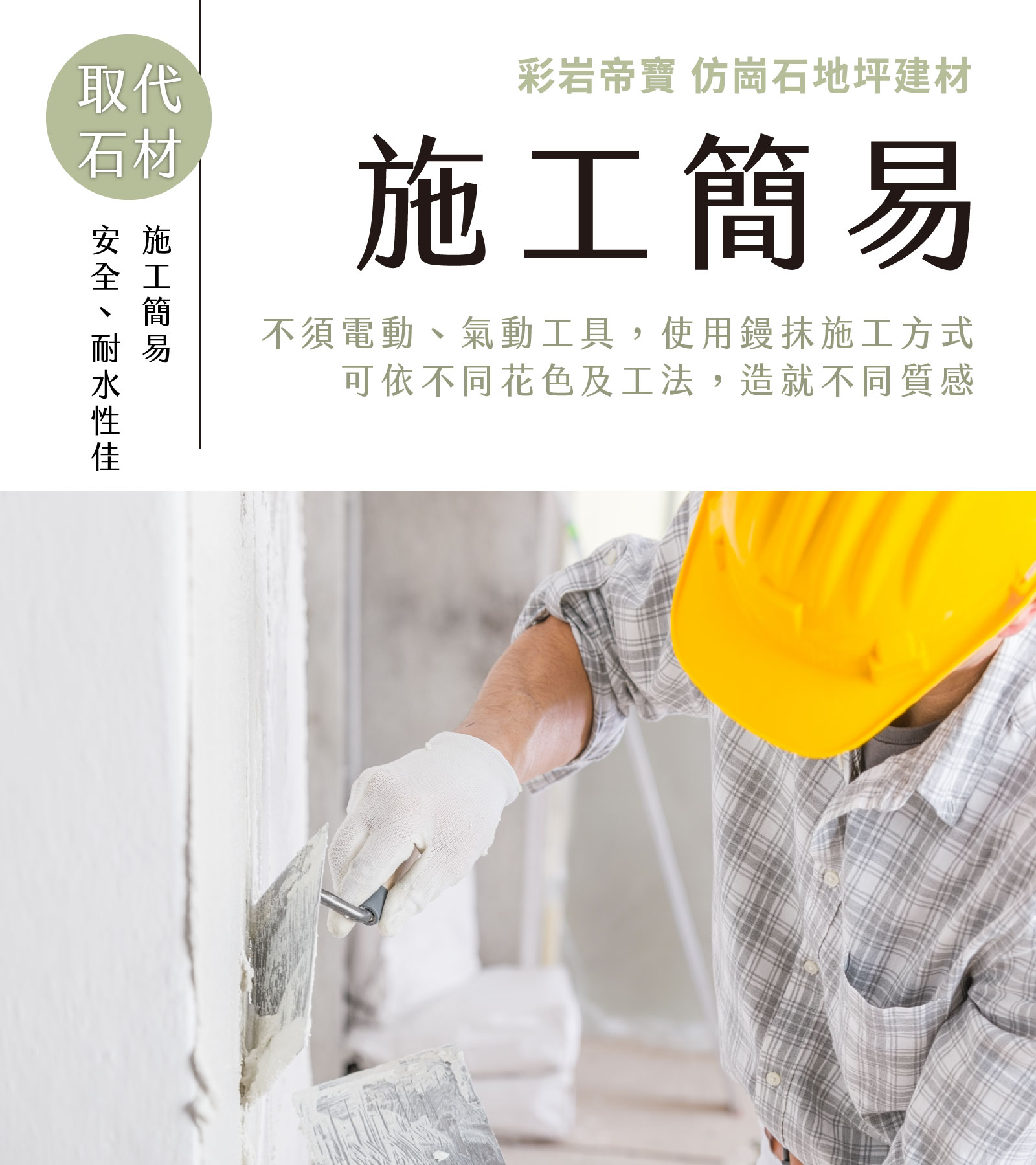 主要成份是水性壓克力樹脂,呈現液狀,施工完後會呈現石材凹凸紋理的漆面