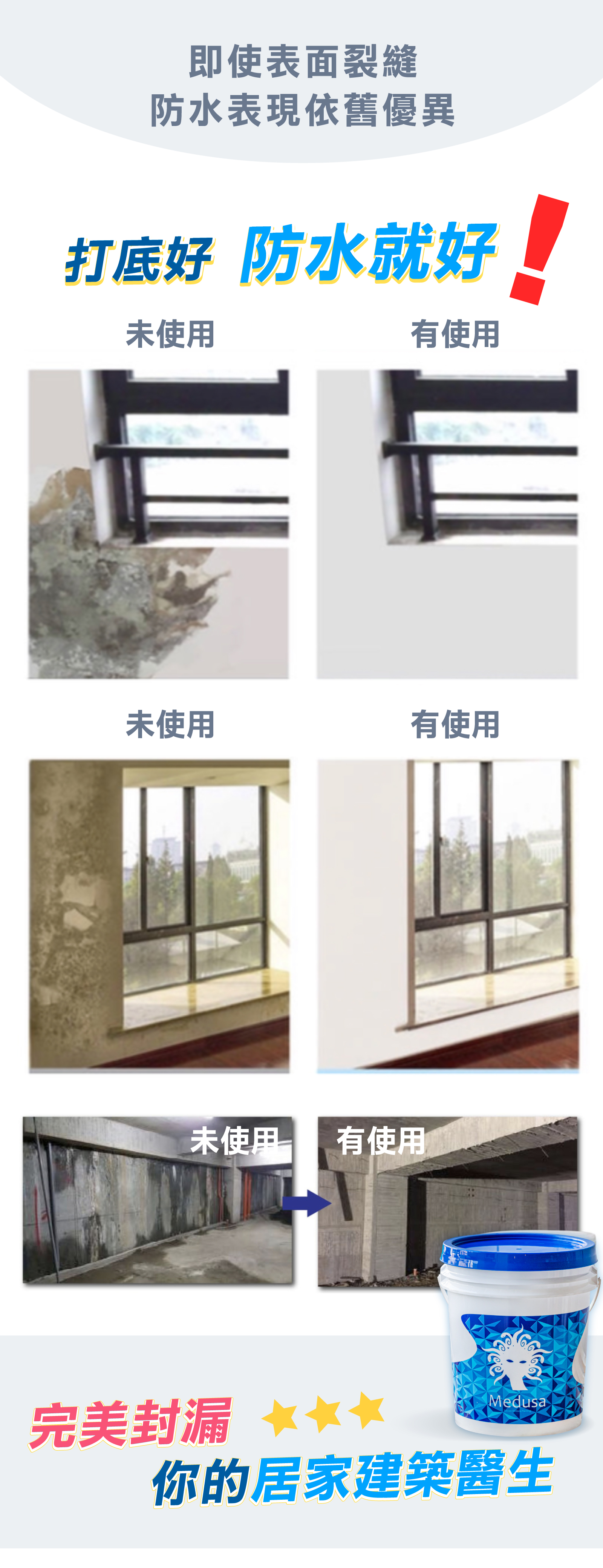 植物液態防水塗料,與水泥共工,節省50%工時,承受正、負水壓,防止吐白,避免白華產生。