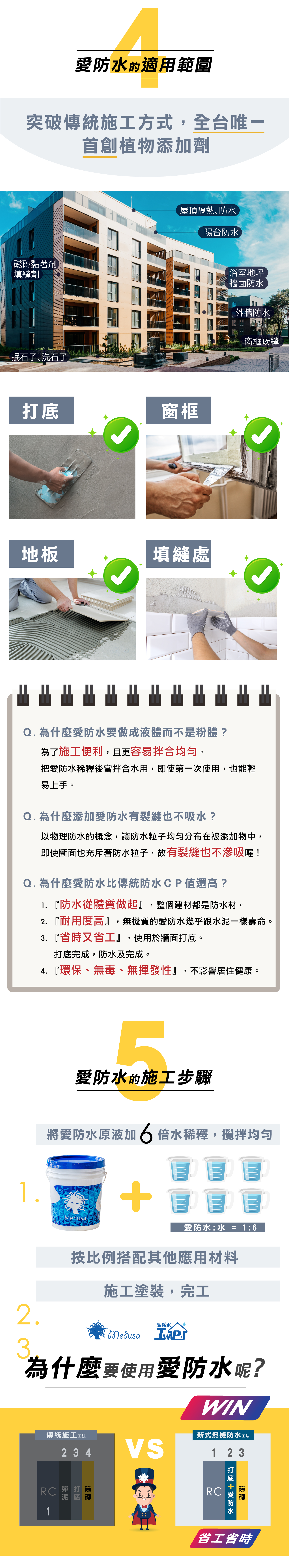 施工簡易,液態均勻混合加入,造就優異防水性能,為水泥砂漿防水添加劑防水塗料,無毒無味之安全防水配方
