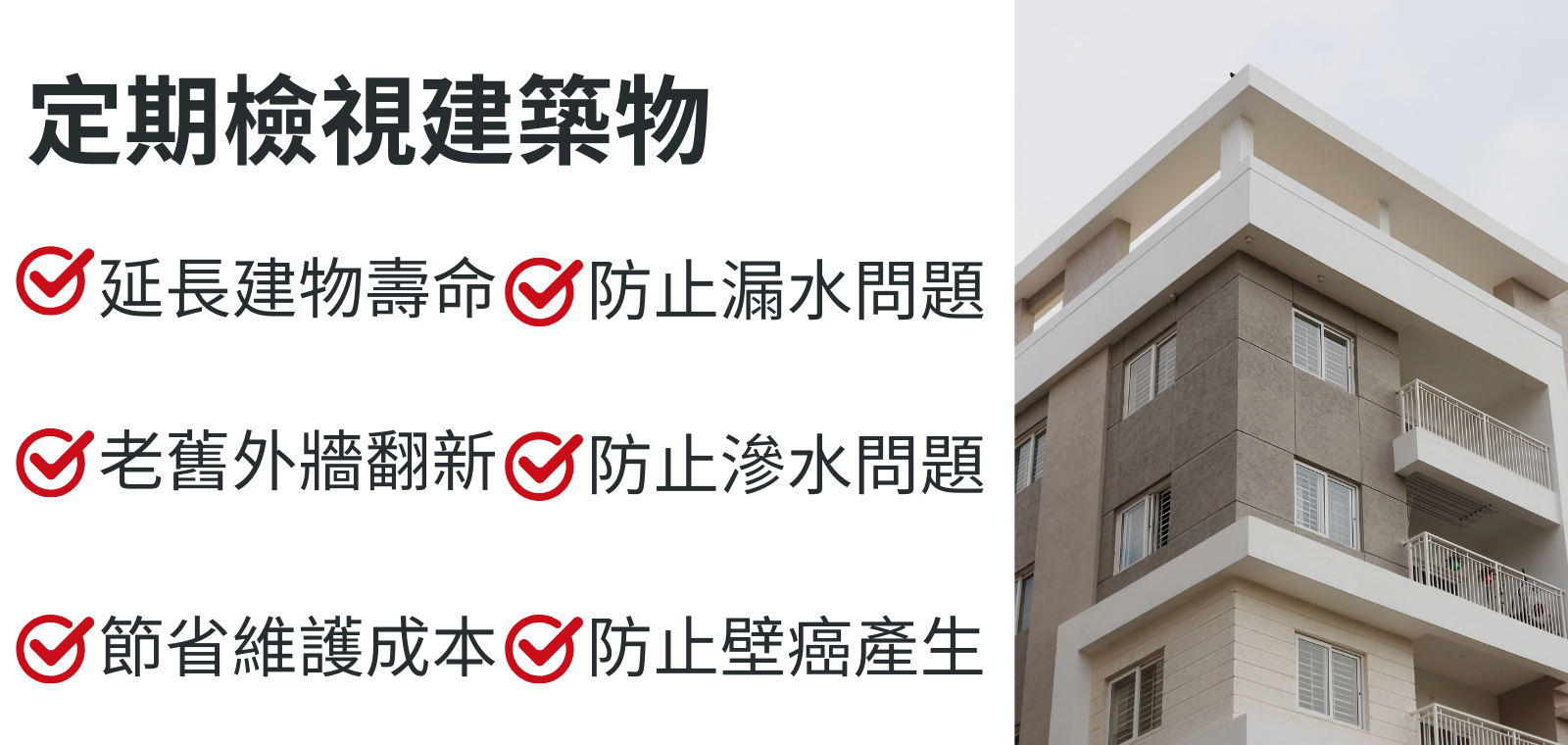 延長建物壽命、老舊外牆翻新、節省維護成本、防止漏水問題、防止滲水問題、防止壁癌產生