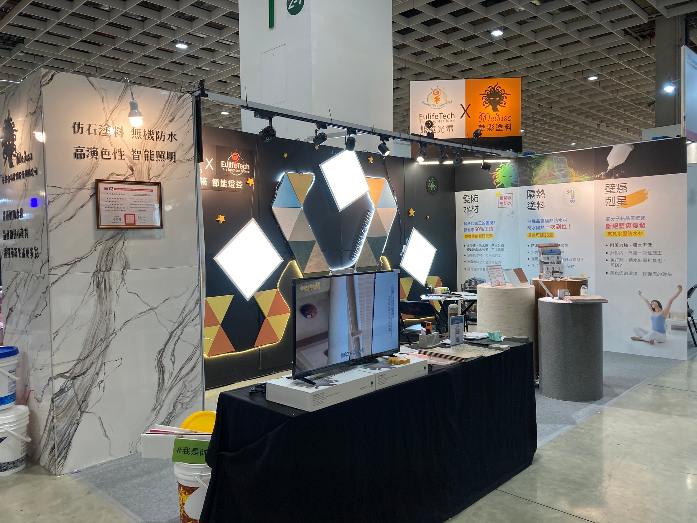 2020台北國際建築建材暨產品展,展出「節能燈控x智慧建築」,透過燈光與色彩及色塊拼接的搭配,展現熱情活力的視覺效果。