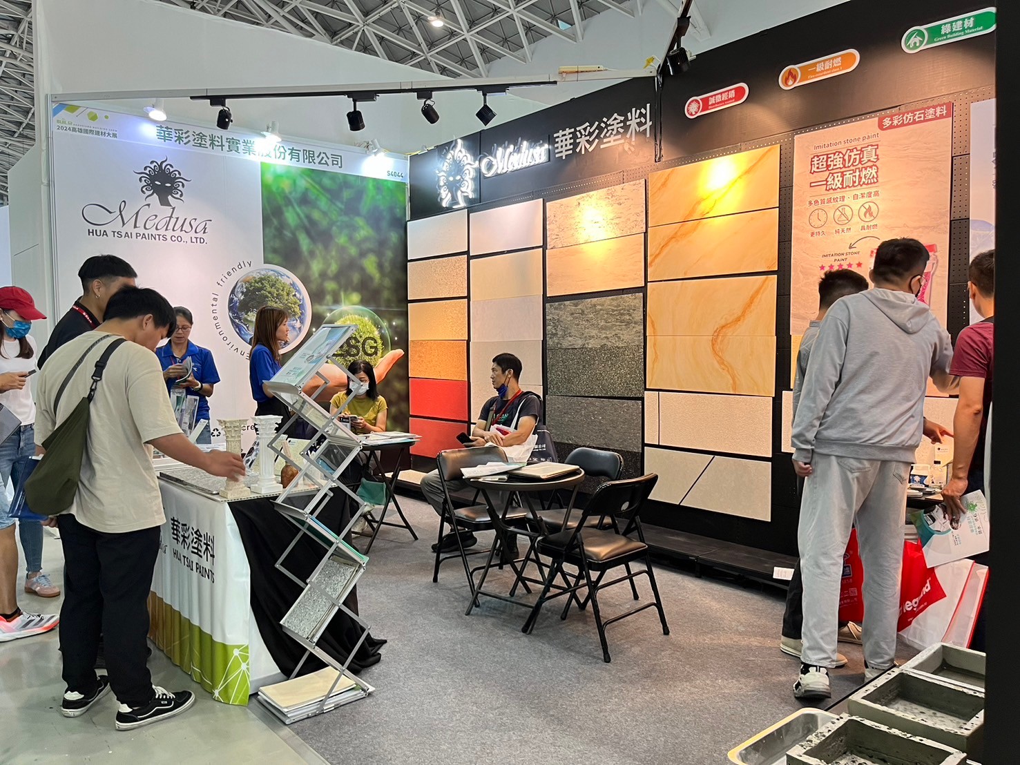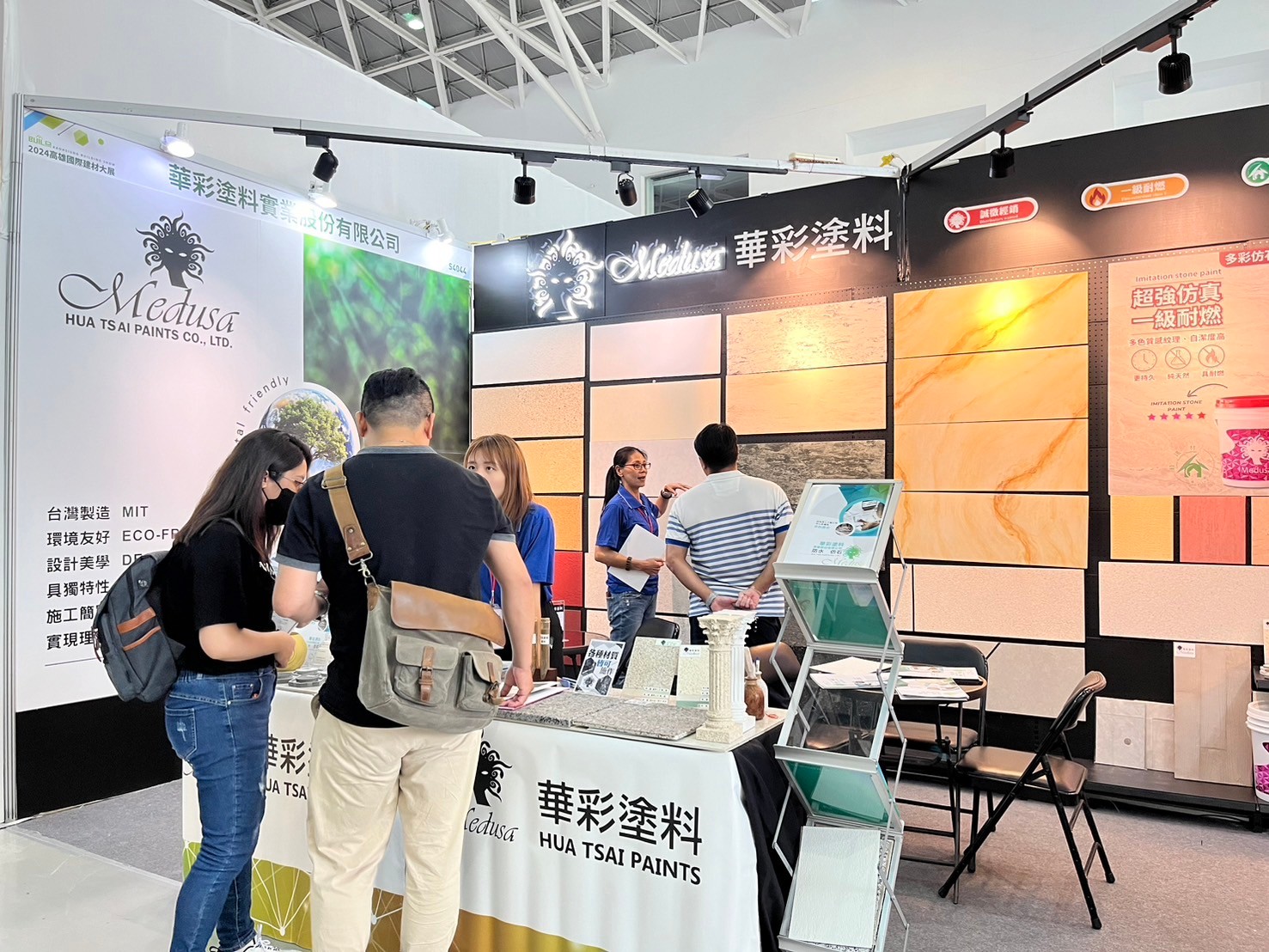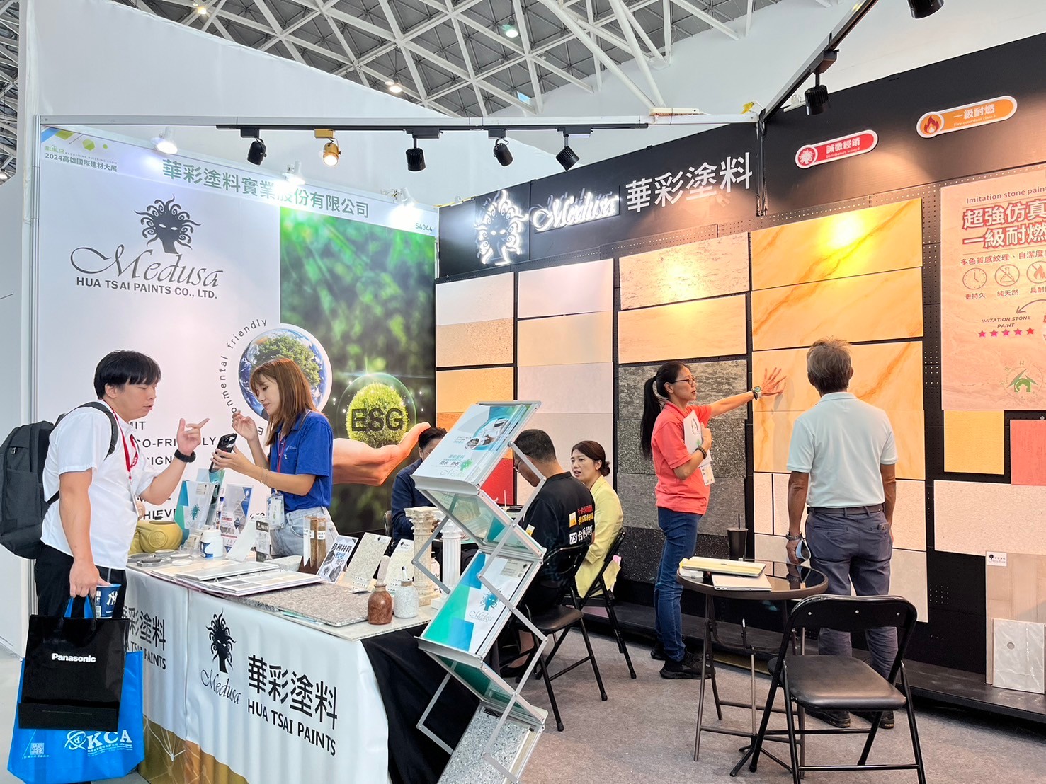 華彩塗料(Hua Tsai)參與2024高雄國際建築建材暨產品展,展示隔音材料、外牆、內牆、地坪塗料系列、防水材、隔熱材料,包括仿石漆、仿岩漆、紋理漆、防水添加劑、隔熱塗料...等同步亮相。