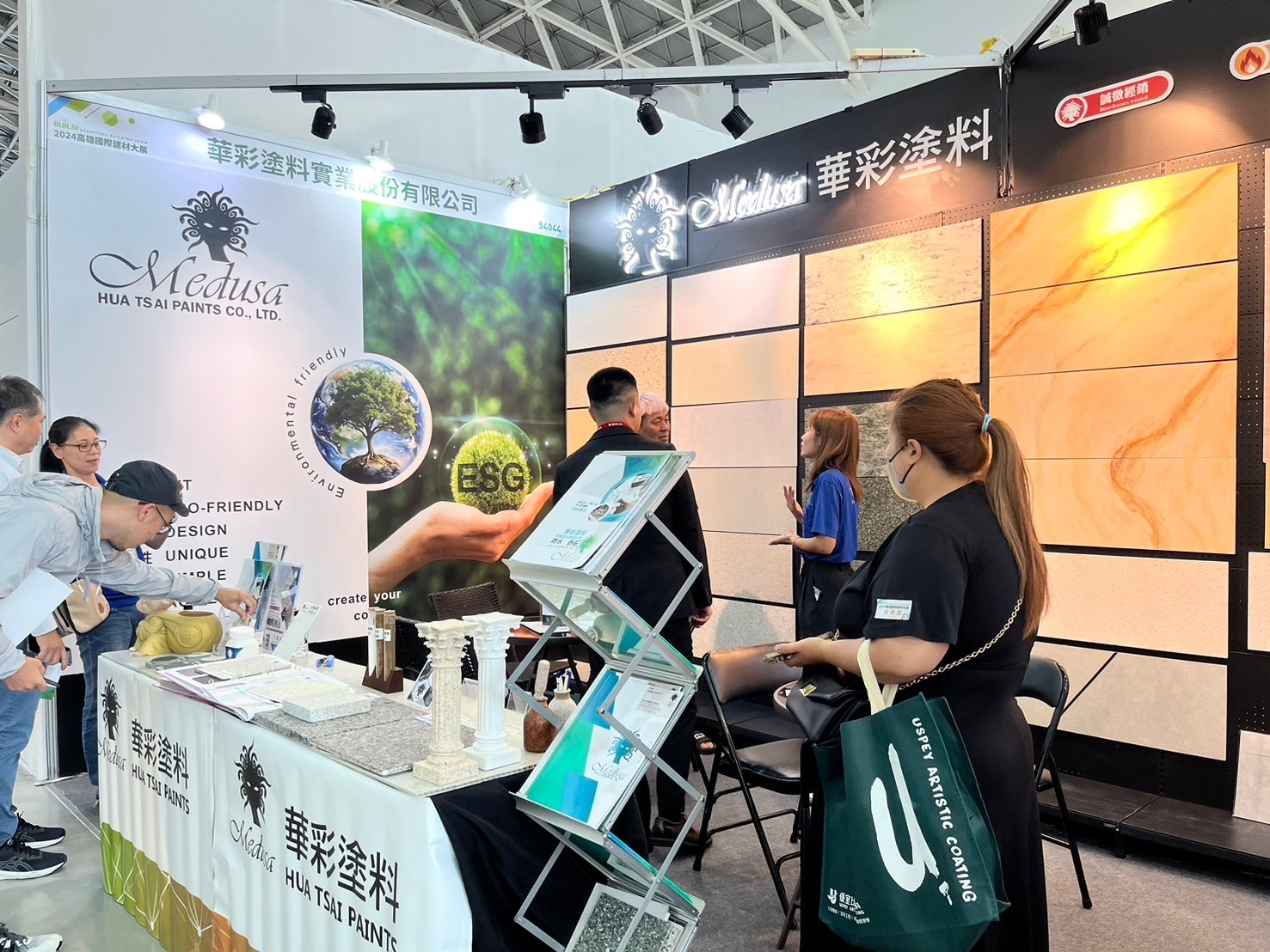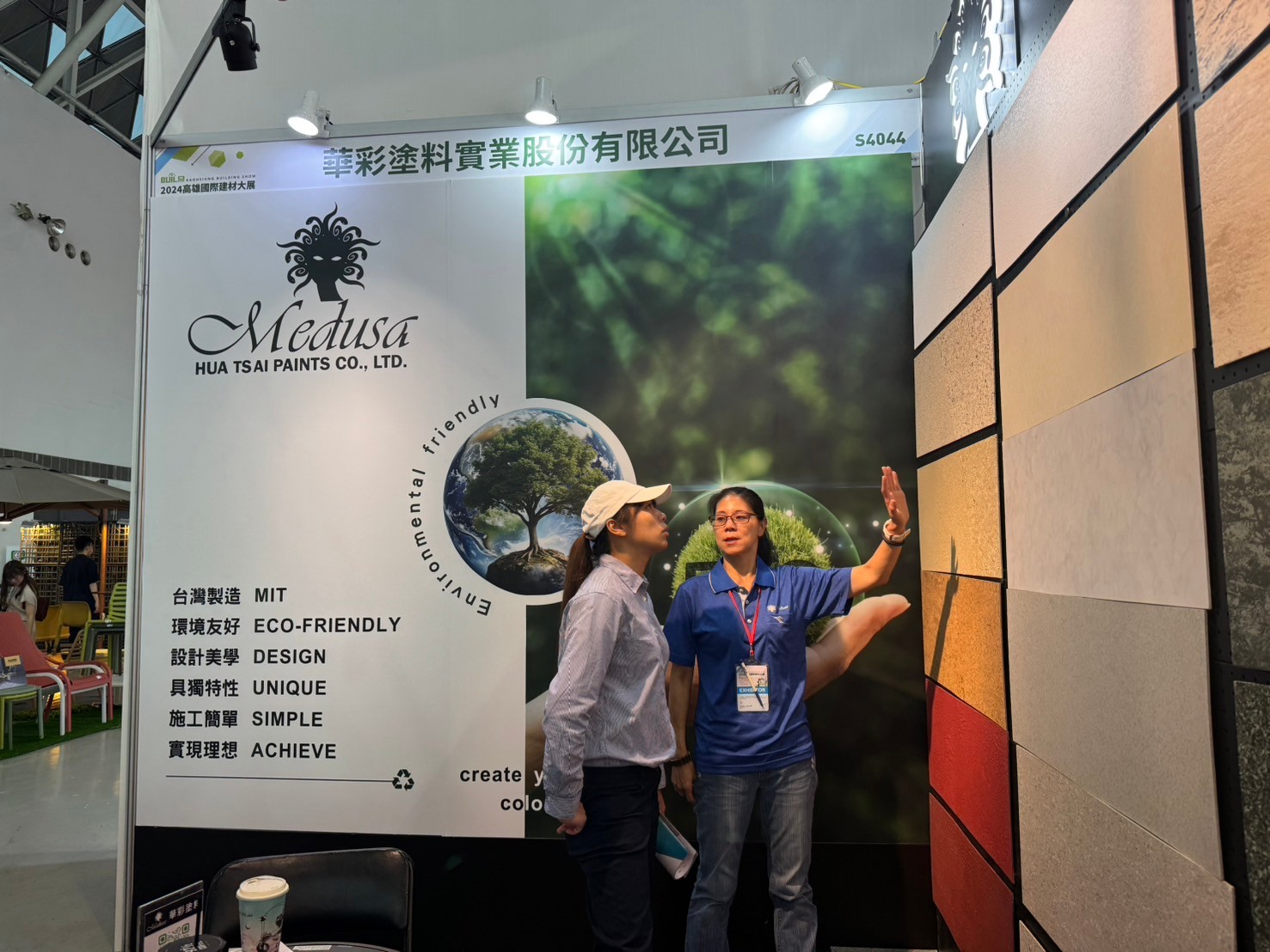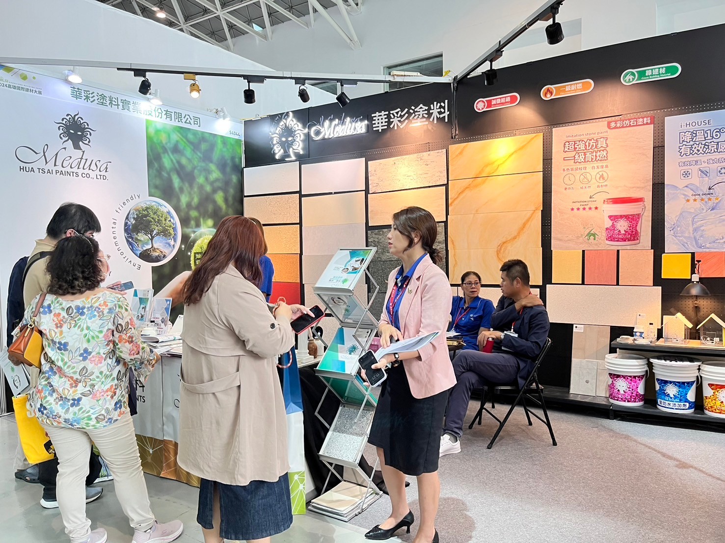 華彩塗料(Hua Tsai)參與2024高雄國際建築建材暨產品展,展示隔音材料、外牆、內牆、地坪塗料系列、防水材、隔熱材料,包括仿石漆、仿岩漆、紋理漆、防水添加劑、隔熱塗料...等同步亮相。