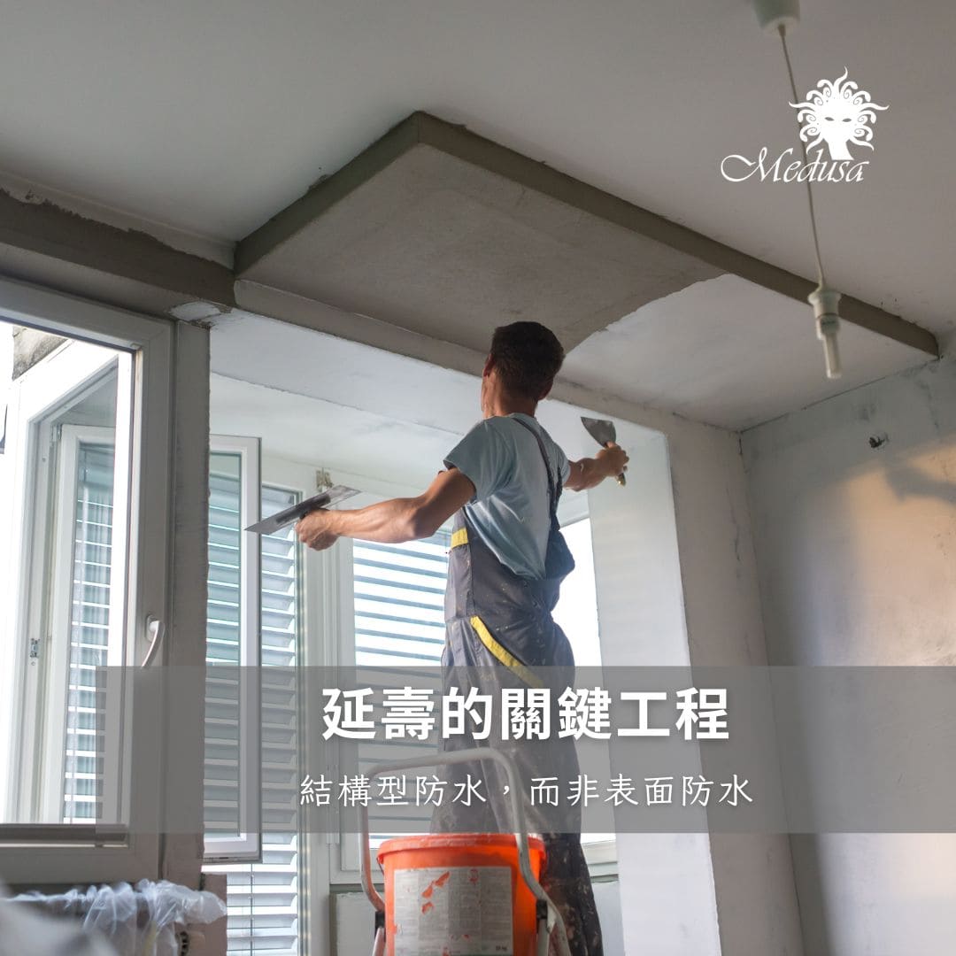 在延壽工程中,重點放在「結構層防水」,讓水即使接觸表面,也無法沿著毛細孔進入混凝土內部。