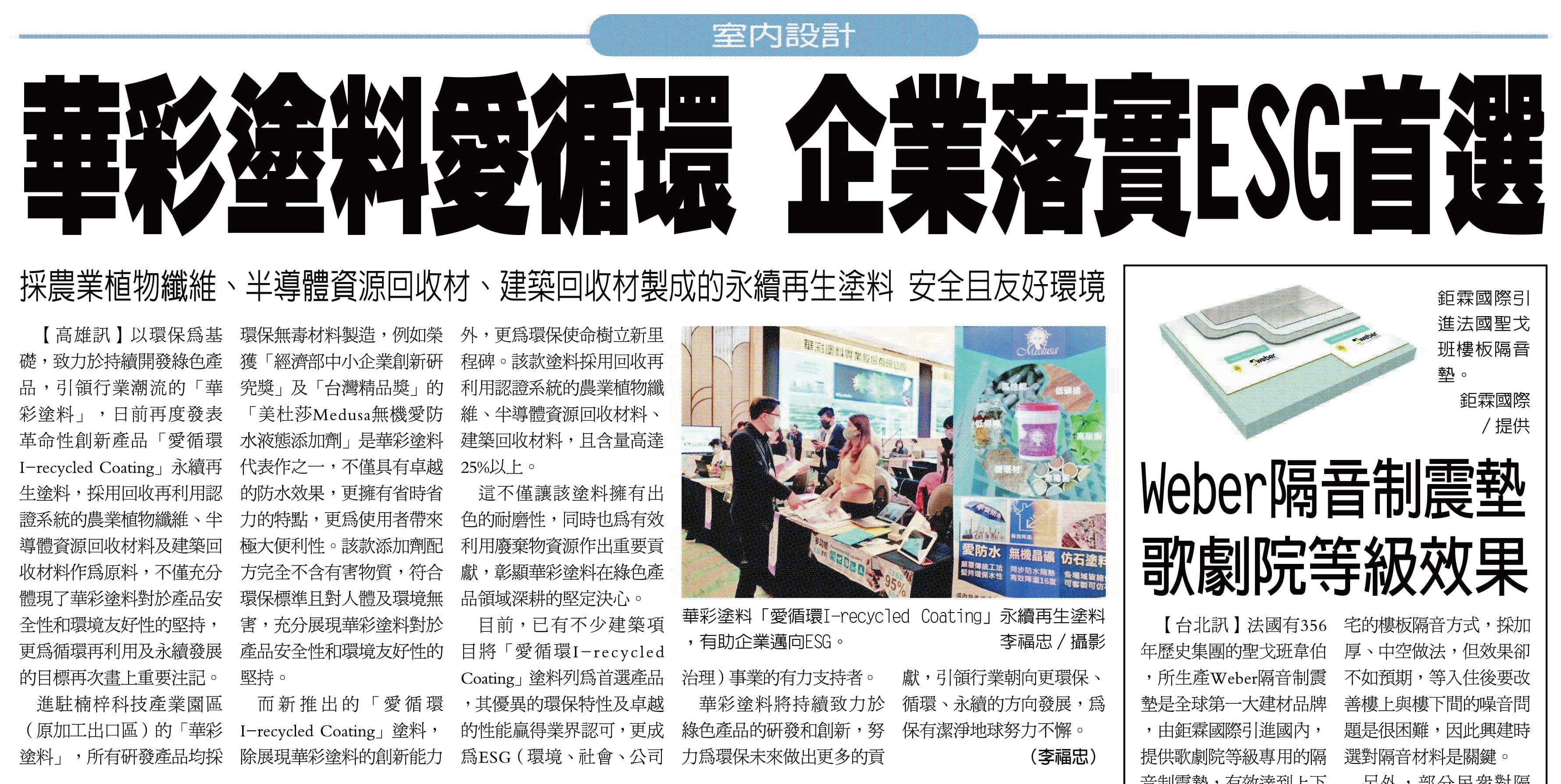 而新推出的產品「愛循環I-recycled Coating」塗料,不但富有創新性且產品具有出色的耐磨性,更為環保使命樹立新里程碑。該款塗料採用回收再利用認證系統的農業植物纖維、半導體資源回收材料、建築回收材料,且含量高達25%以上。