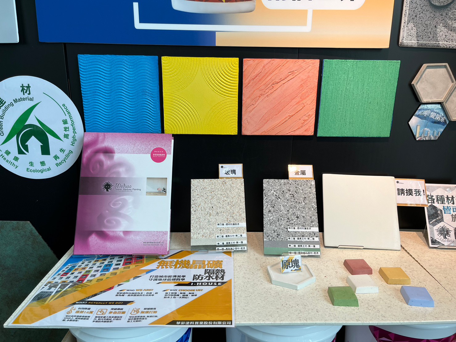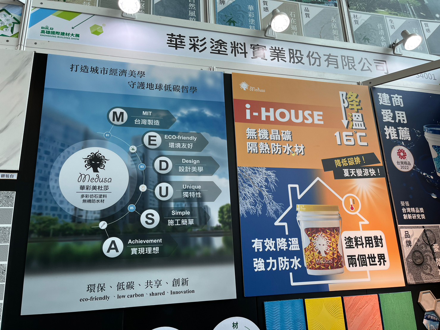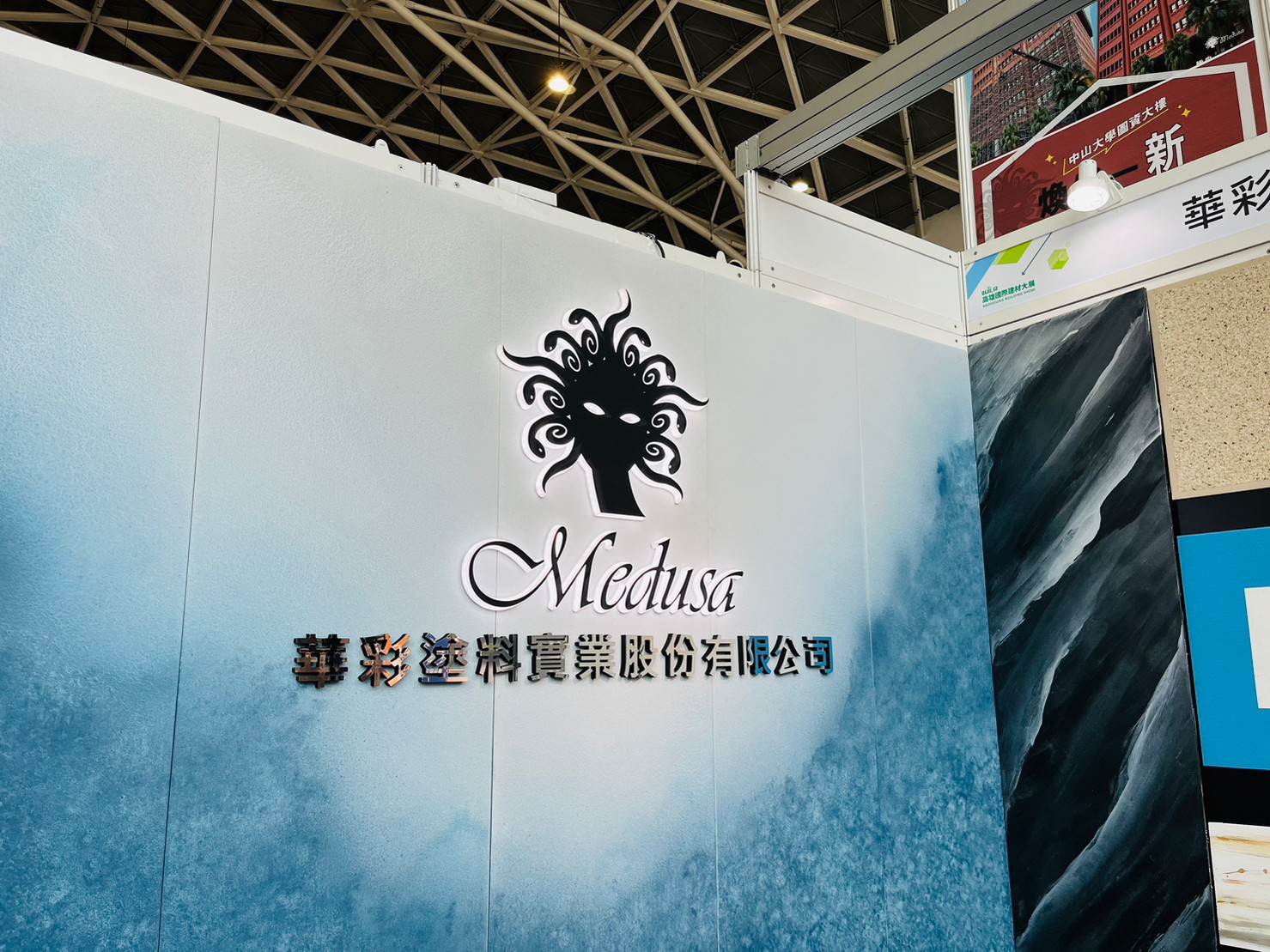 華彩的「多功能藝術塗料」,其為水性塗料,運用不同的工具可呈現出仿真石材、仿花崗岩或是磁磚等各種不同地紋理與質感,不僅美觀大方,更具有防水、隔熱、質地輕、施工方便等多項優勢及功能。成為最環保的新一代綠色建材,不僅進駐經濟部高雄楠梓加工出口區,更以MIT研發製造的「台灣美杜莎Medusa」品牌打出國內外市場。