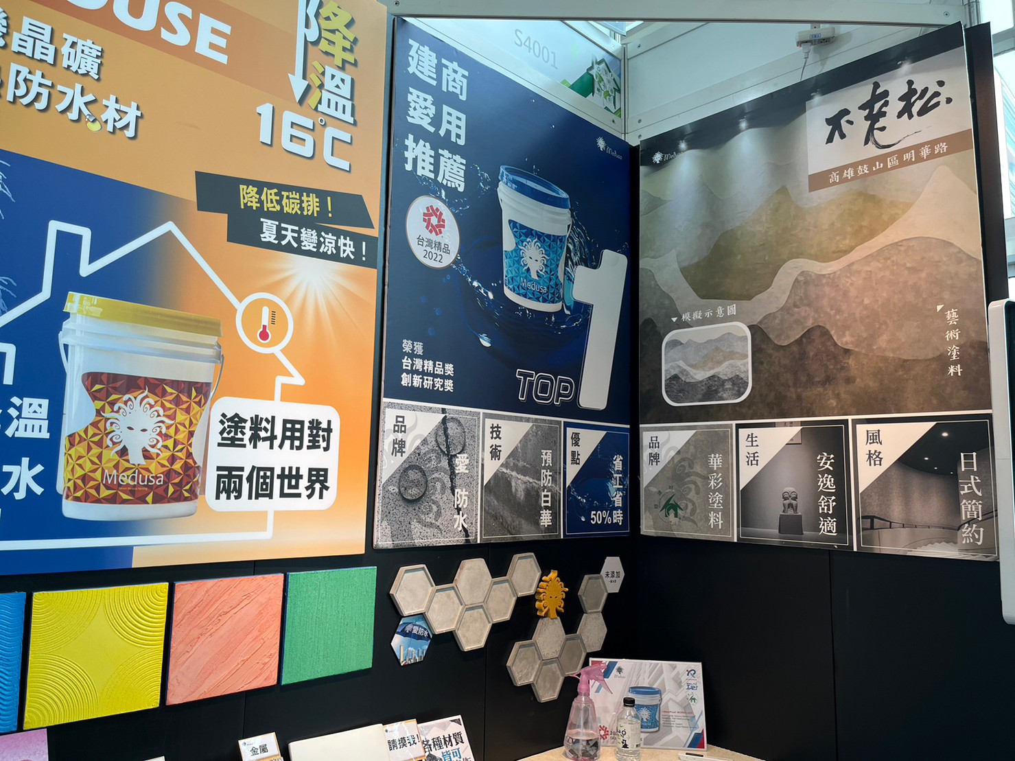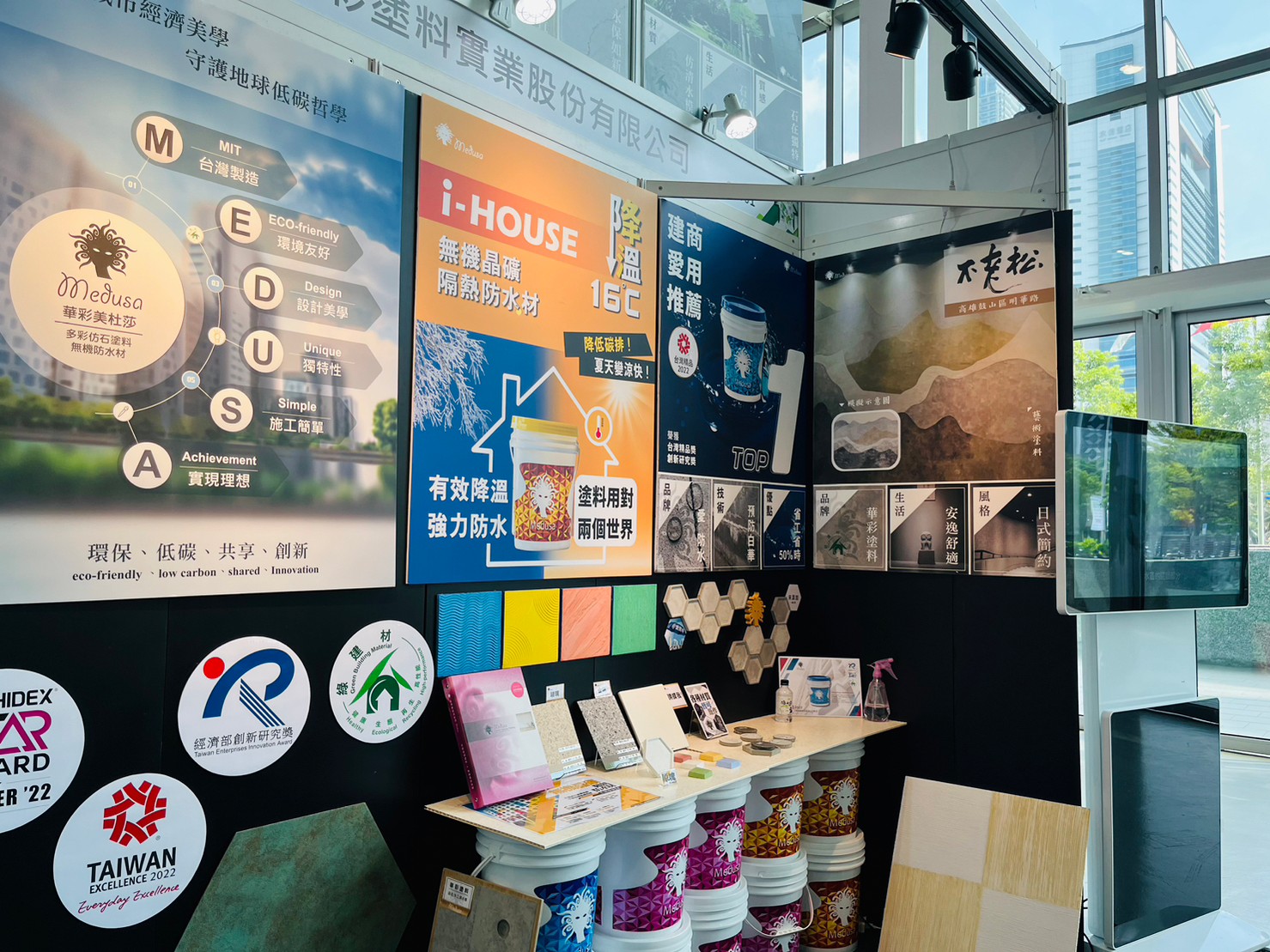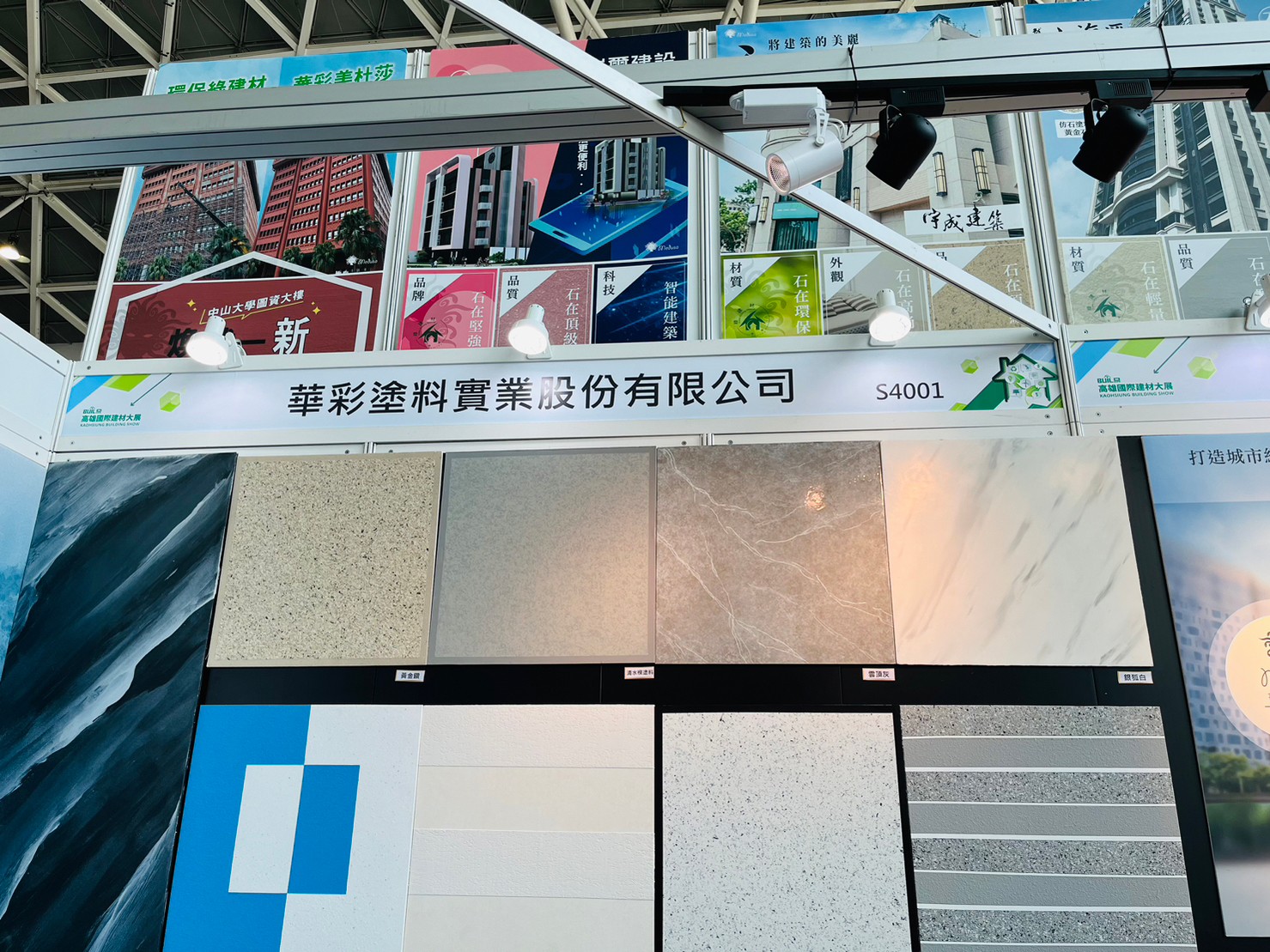 華彩的「多功能藝術塗料」,其為水性塗料,運用不同的工具可呈現出仿真石材、仿花崗岩或是磁磚等各種不同地紋理與質感,不僅美觀大方,更具有防水、隔熱、質地輕、施工方便等多項優勢及功能。成為最環保的新一代綠色建材,不僅進駐經濟部高雄楠梓加工出口區,更以MIT研發製造的「台灣美杜莎Medusa」品牌打出國內外市場。