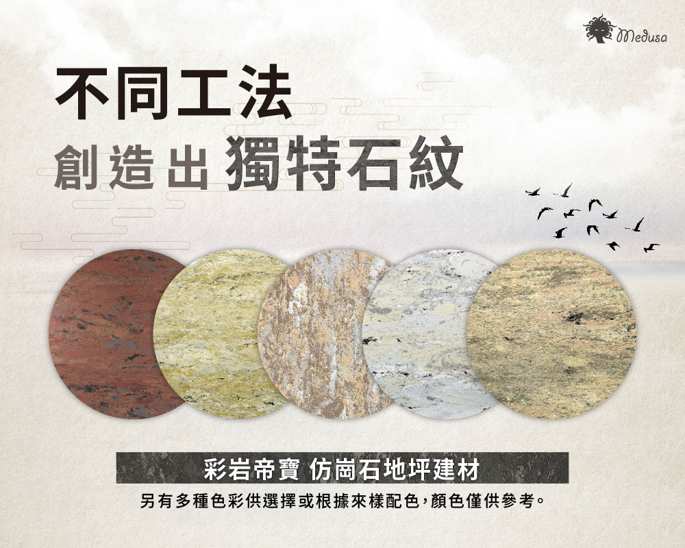 色彩繽紛多樣:內含多種自然礦石調製色系,從沉穩灰、岩石棕到砂岩米色,無論現代、日式、工業或鄉村風格,都能完美融入。