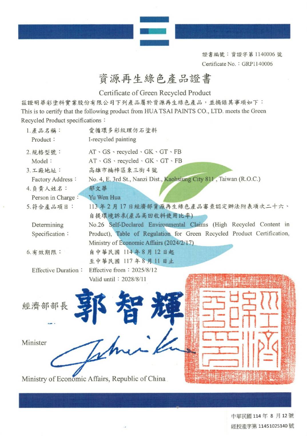 在推動循環經濟的路上,華彩塗料推出的「愛循環塗料」成功結合再生原料與低碳製程,不僅兼具耐候、美觀與施工效率,更獲得 資源再生綠色產品證書 的肯定。