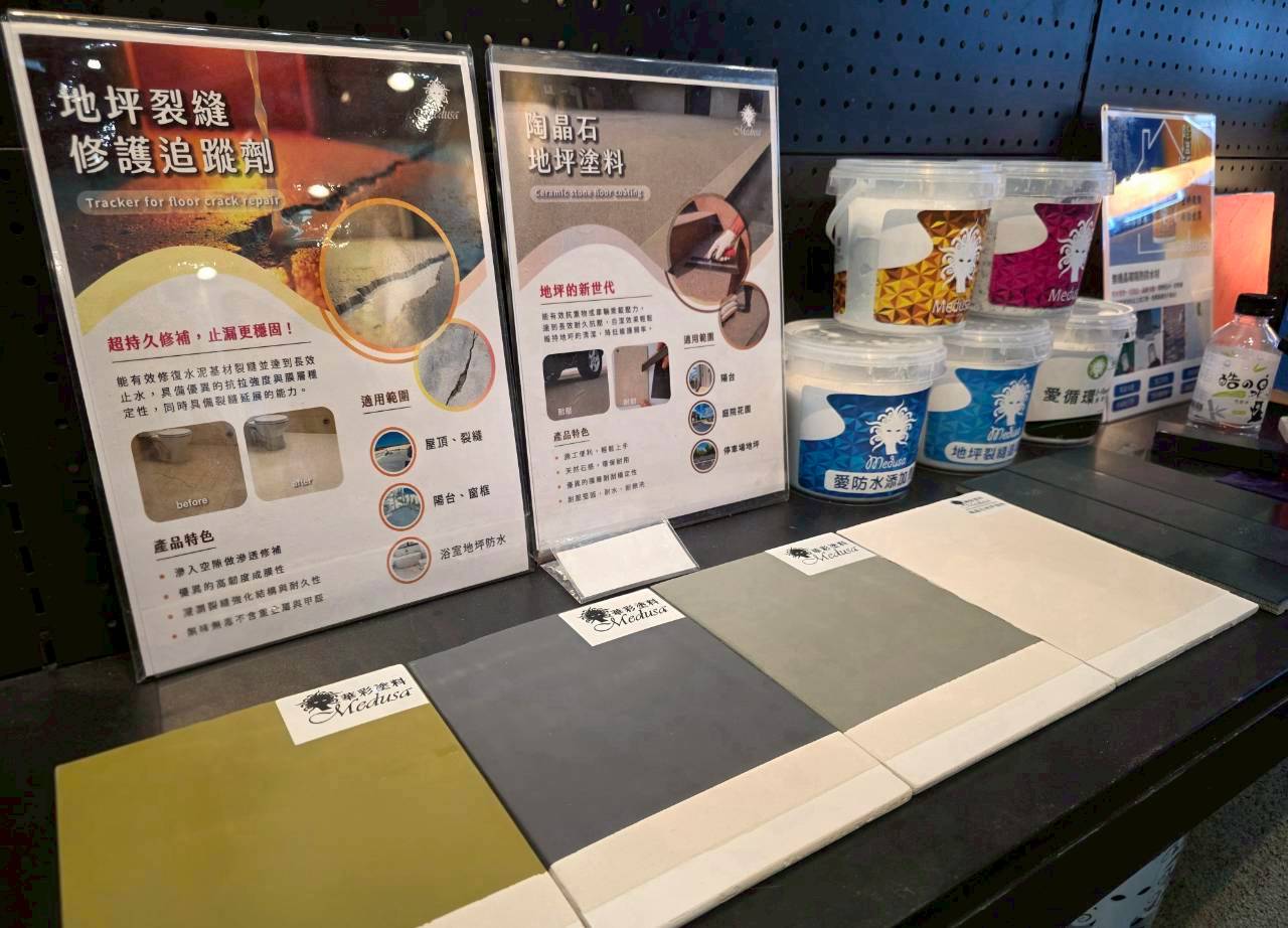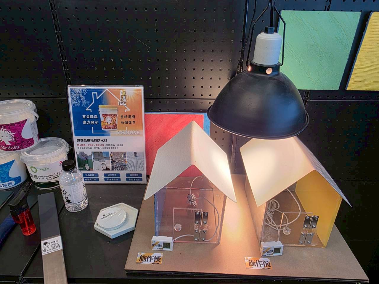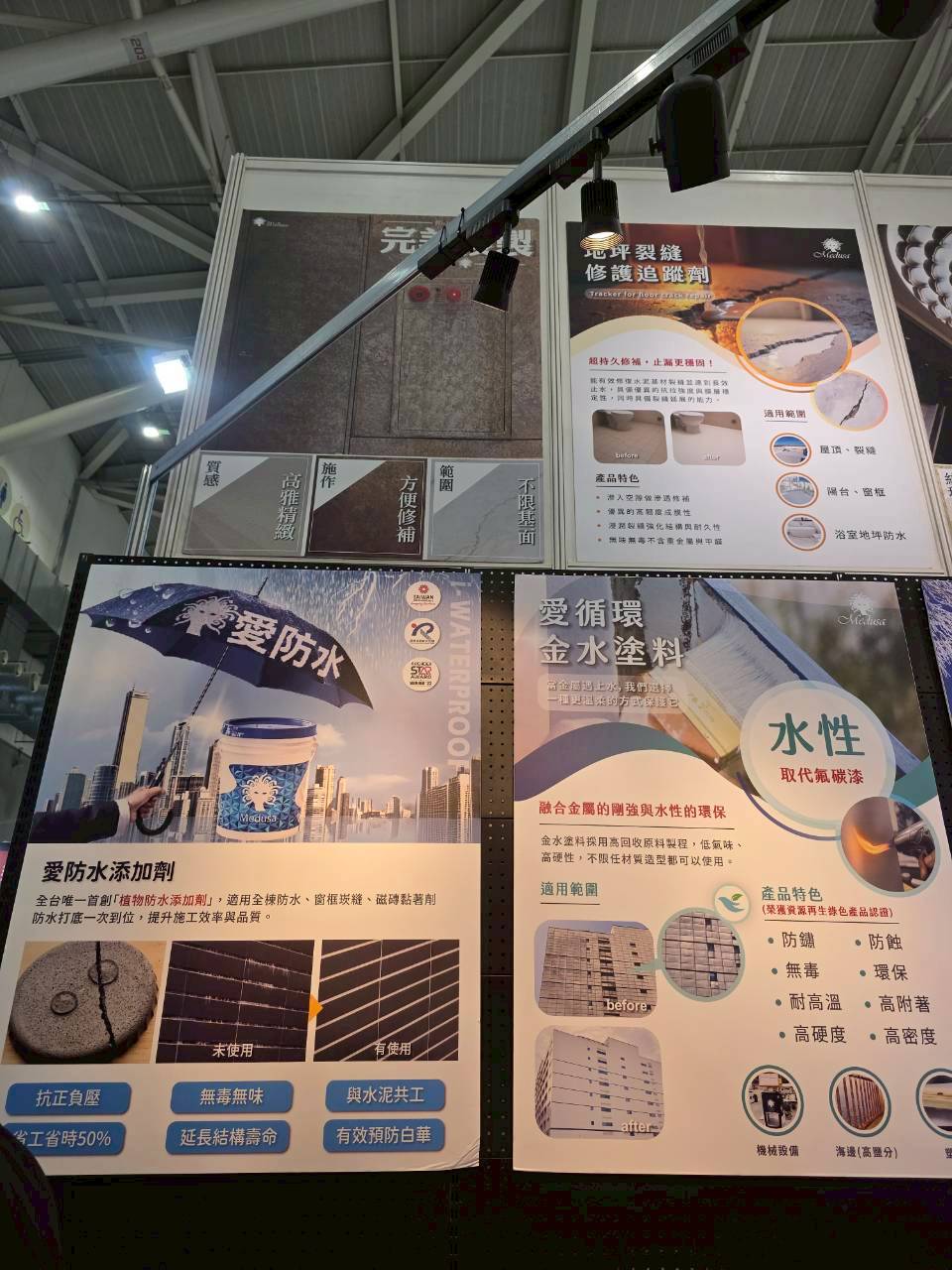 針對屋頂與外牆隔熱需求,華彩的無機晶礦隔熱防水材同樣成為展場關注焦點。該系統運用高反射率的無機晶礦結構,能有效反射太陽輻射熱,減少熱能傳導進入建築內部。