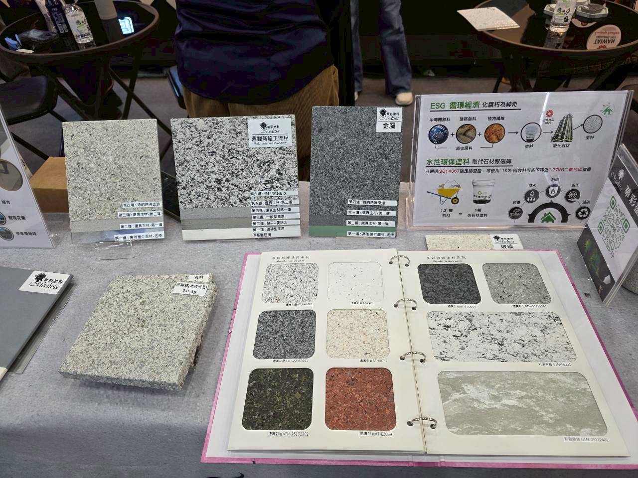 華彩塗料長期深耕環保再生塗料研發,旗下「愛循環 I-recycled Coating 多彩紋理仿石塗料」系列,採用半導體製程後回收邊角料、建築餘料與無機礦物再製而成,成功將產業廢棄物升級為高性能建築塗裝材料。