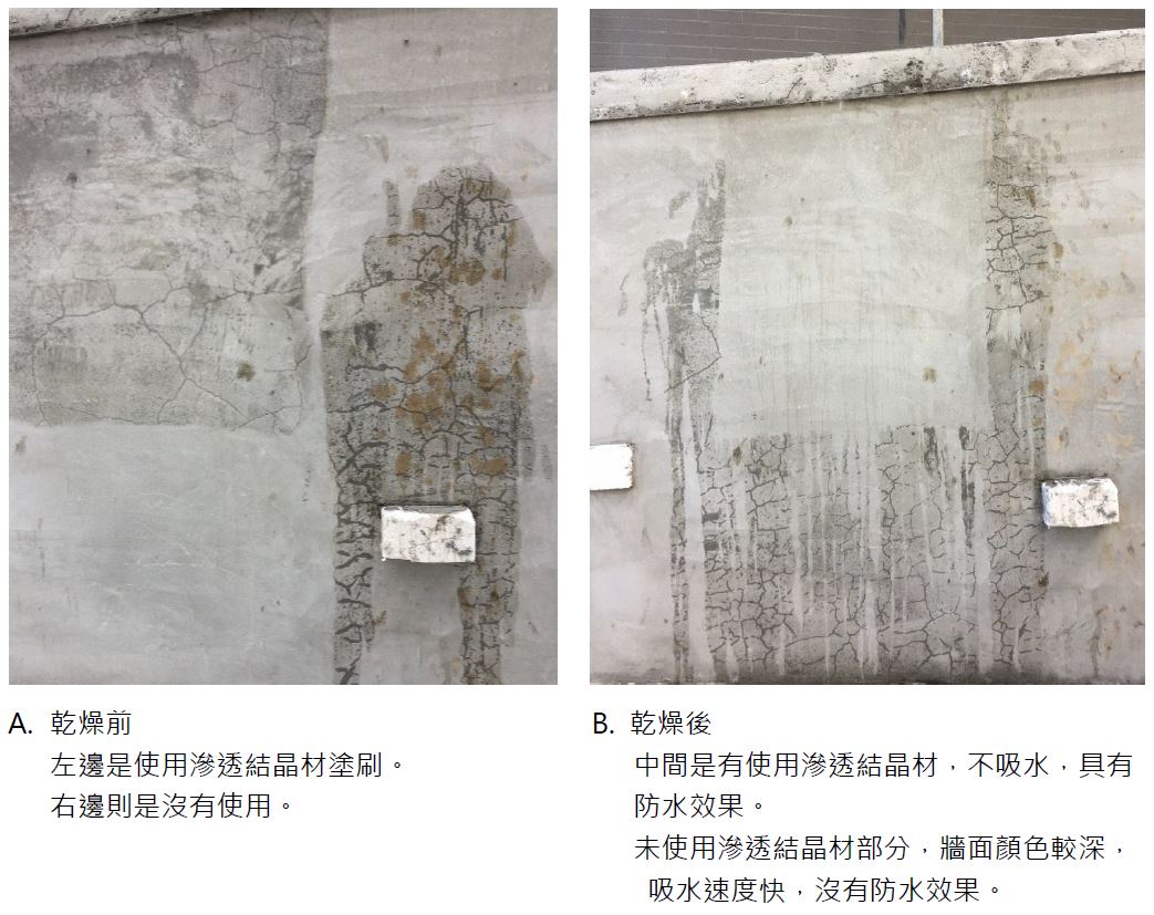 H. 滲透結晶材防水塗料使用結果如下: