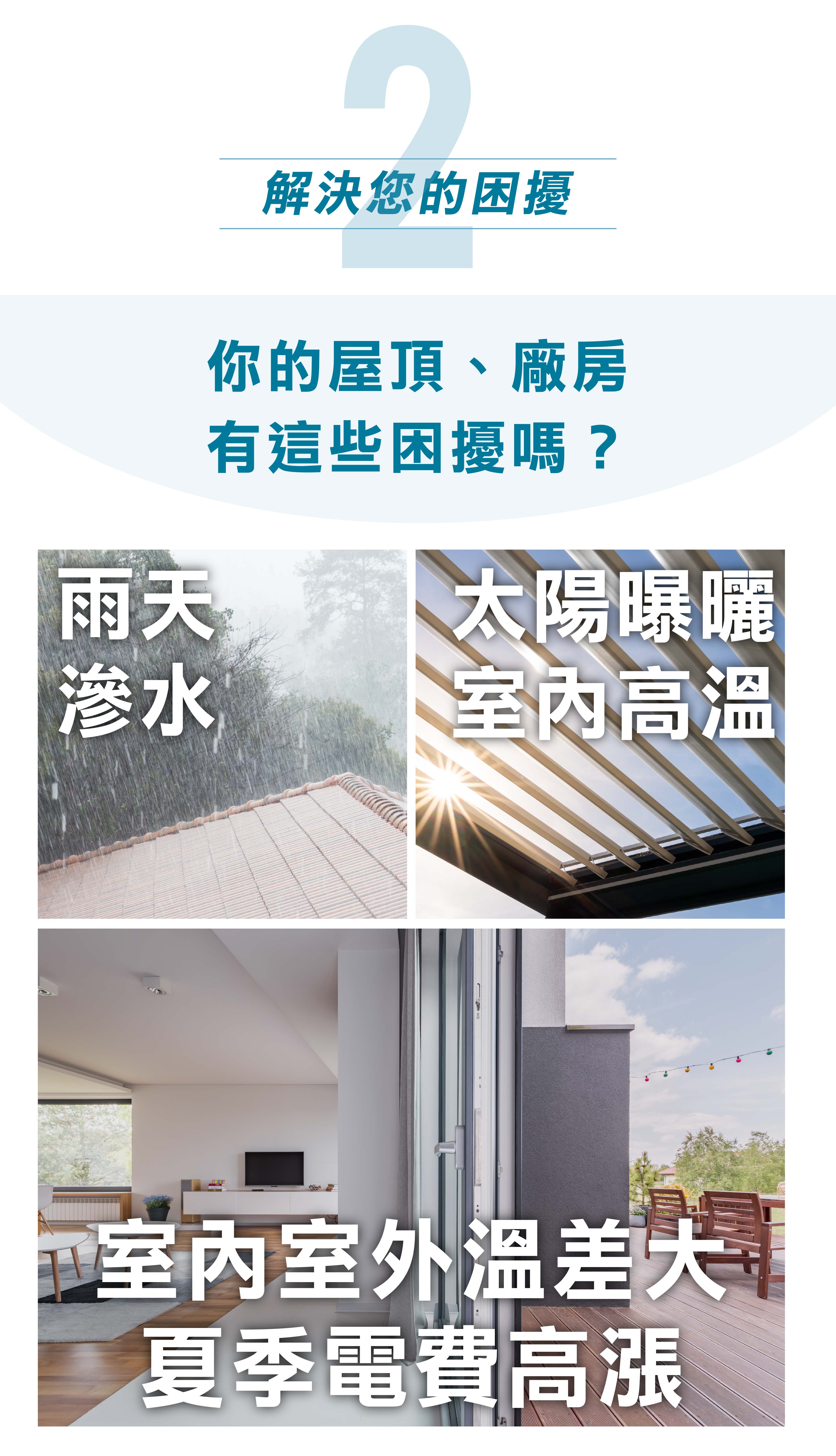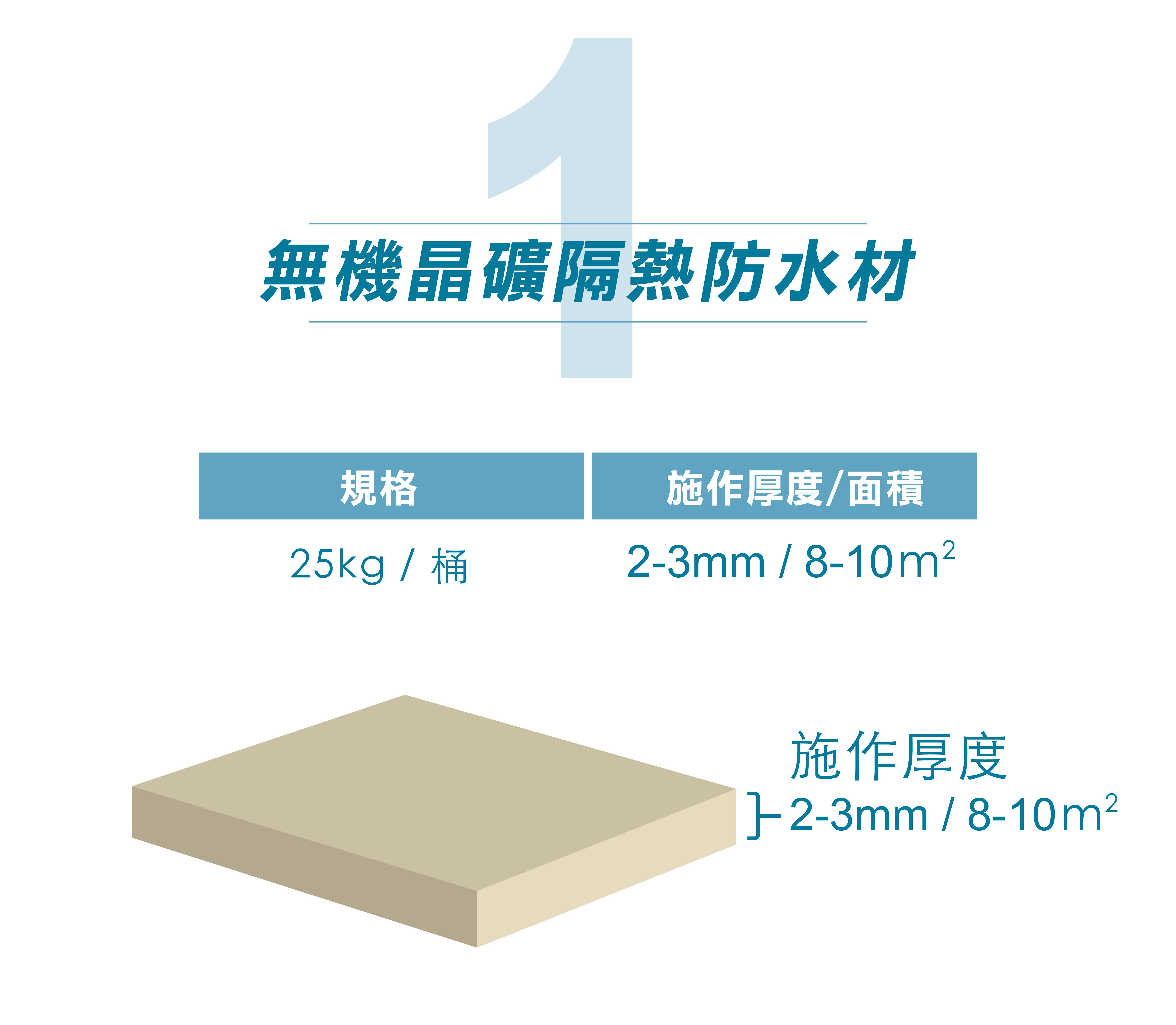 2.純水性水泥基材質,針對屋頂改修及新建屋頂防水工程使用的隔熱漆。其效能防水兼具隔熱,使用壽命長,施工簡易。
